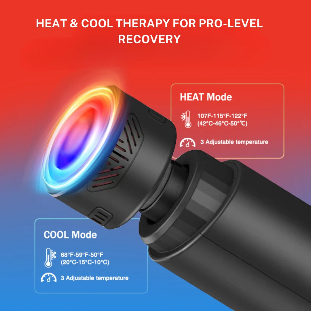 Flowive Edge includes 5 interchangeable heads. The heat/cool head offers warming or cooling, while the other four (round, bullet, flat, fork) give you options for different massage styles. Avoid using on bones, open wounds, or sensitive areas.