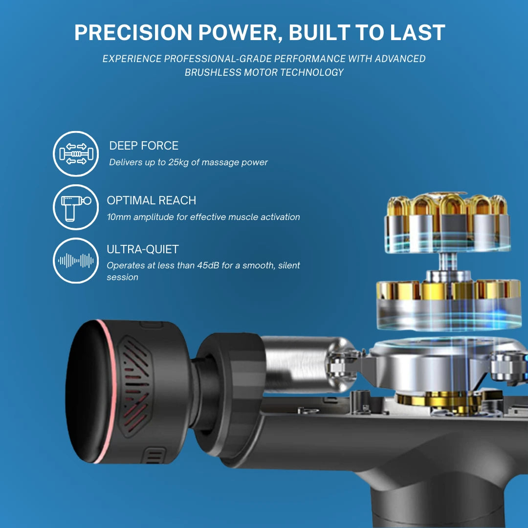 Flowive Edge uses a brushless motor with up to 15 kg force and 10 mm amplitude. You can choose lower speeds for lighter sessions or higher speeds for a more intense massage experience.